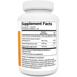 Microcrystalline cellulose, vegetable capsule (hydroxypropyl methylcellulose and purified water), vitamin D3 (cholecalciferol), magnesium stearate (vegetable source), medium-chain triglyceride oil powder, vitamin B6 (pyridoxine HCl), vitamin K2 (menaquinone-7)